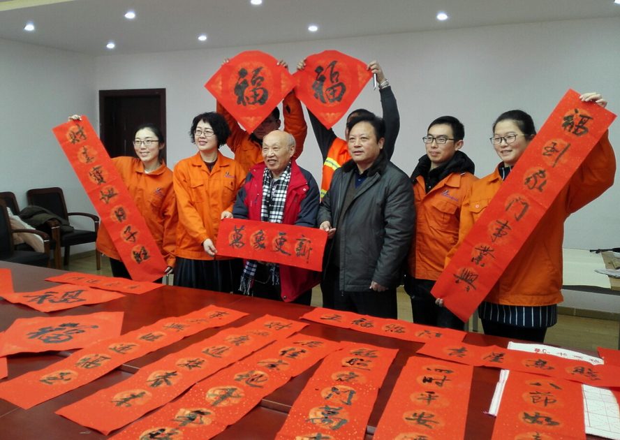 120,連云港市雜文學(xué)會(huì)邀請(qǐng)陳鳳桐等3名知名書(shū)法家走進(jìn)華茂綠化工程公司,為一線環(huán)衛(wèi)職工寫(xiě)春聯(lián),送上濃濃的新春祝福!