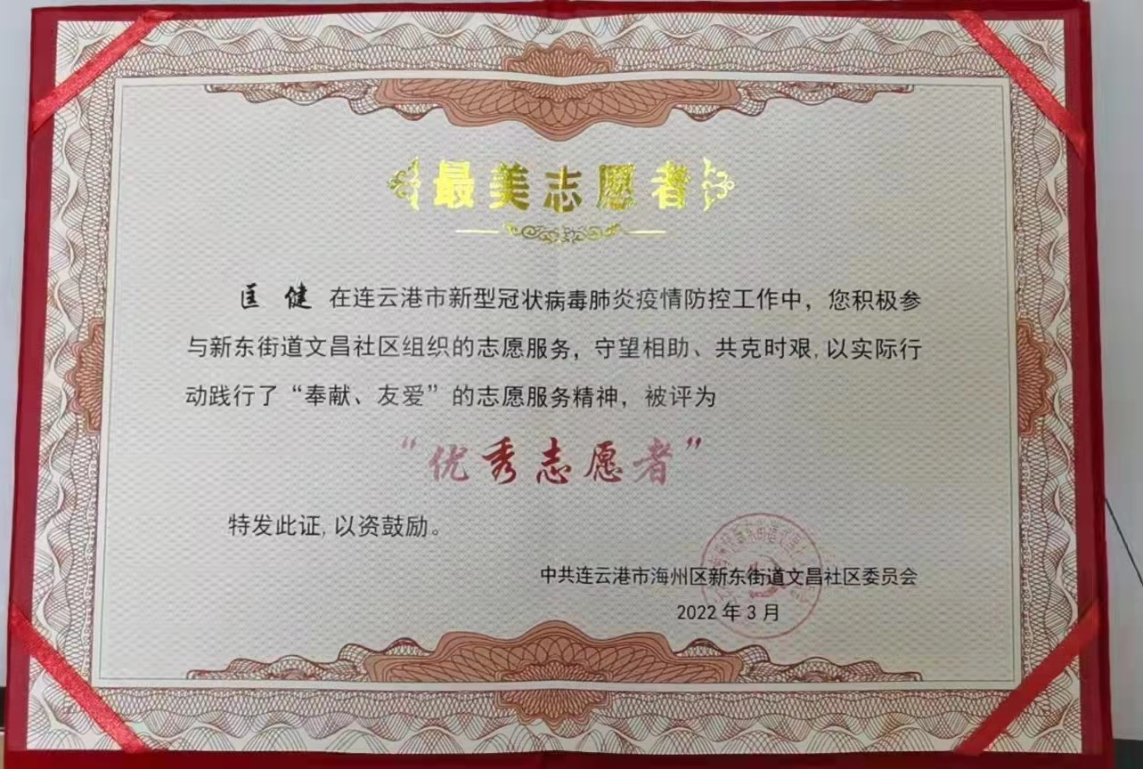 近日,公司黨員匡健、王長(zhǎng)春分別被新東街道文昌社區(qū)、路南街道朝陽社區(qū)授予“最美志愿者”和“抗疫先鋒志愿者”。感謝他們?cè)谝咔榉揽仄陂g舍小家顧大家,同舟共濟(jì)戰(zhàn)疫情、共克時(shí)艱同擔(dān)當(dāng),守護(hù)居民群眾的健康安全,為打贏疫情防控阻擊戰(zhàn)發(fā)揮了積極作用。
