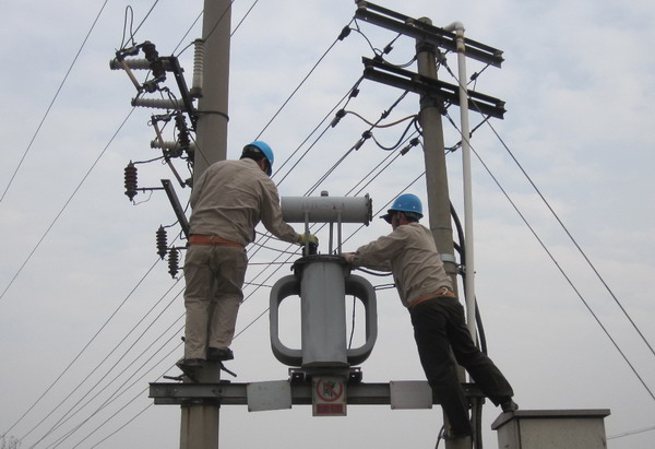 圖為該所職工在黃下線養(yǎng)殖場(chǎng)公變進(jìn)行檢修