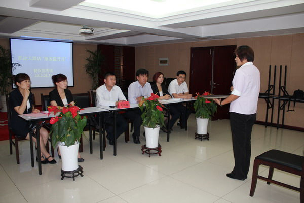 10月12日,淮鹽大酒店“服務(wù)提升月”主題活動(dòng)圓滿結(jié)束。經(jīng)逐個(gè)考核參訓(xùn)員工,結(jié)果令人滿意,達(dá)到了預(yù)期效果,為下一步的“出品質(zhì)量月”活動(dòng)開了個(gè)好頭。