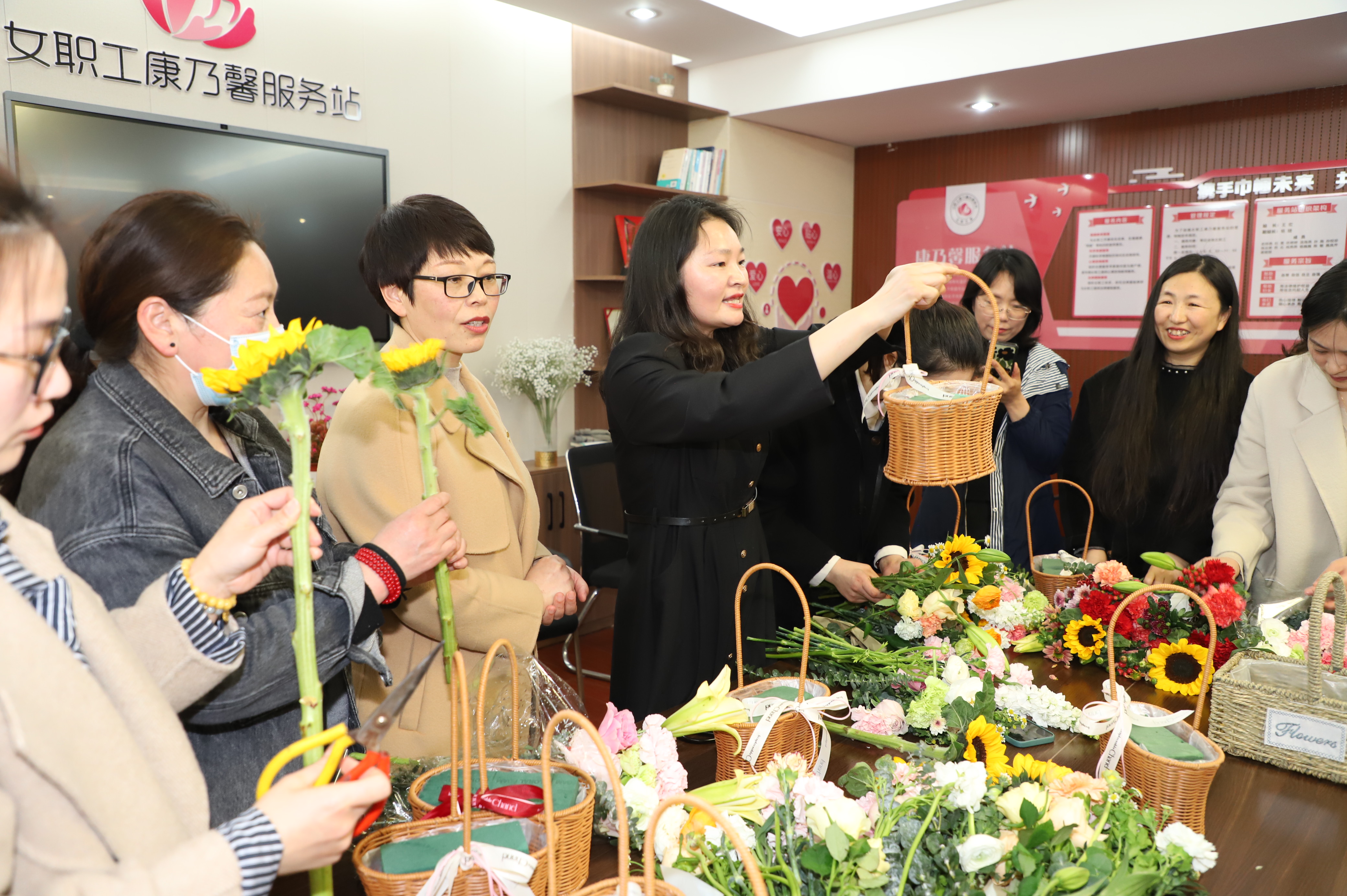 隨后開展的藝術(shù)插花活動(dòng),更是將節(jié)日慶祝氣氛推向了高潮。活動(dòng)現(xiàn)場(chǎng),邀請(qǐng)專業(yè)插花老師進(jìn)行現(xiàn)場(chǎng)指導(dǎo),插花老師用通俗易懂的語言講授插花基本技巧,從顏色的搭配、花枝長短的修剪以及造型等方面進(jìn)行細(xì)致講解,大家也紛紛行動(dòng)起來,構(gòu)思設(shè)計(jì),在老師的指導(dǎo)下將各種花材修剪和整枝,忙的不亦樂乎。一盆盆姿態(tài)各異的花在女神們靈巧的雙手下陸續(xù)誕生,形成了一幅幅獨(dú)具匠心又飽含深意的插花作品。感受節(jié)日美的“她”,看著自己親手創(chuàng)作的插花作品,參與活動(dòng)的30多名女職工感到滿滿的成就感和幸福感,現(xiàn)場(chǎng)一片其樂融融。