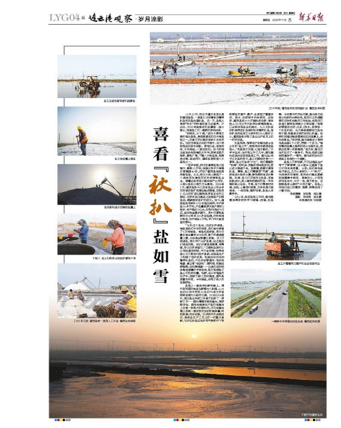 扒鹽現(xiàn)場(chǎng),指揮生產(chǎn)的程龍是土生土長(zhǎng)的“鹽三代”,爸爸和爺爺都是老鹽場(chǎng)人。“和鹽場(chǎng)打交道,心里才踏實(shí)?!贝髮W(xué)畢業(yè)后,在外地工作了幾年,程龍最終還是決定回到鹽場(chǎng)工作。程龍說(shuō),純手工扒鹽的年代,鹽工們都很辛苦——春季,鹽工們迎來(lái)“大忙”。他們需要防“地漏”,用石拱、壓割機(jī)把池底壓實(shí),防止鹵水滲透下去。緊接著,就要忙春季扒鹽。夏季,鹽工們需要防“天漏”,提前將鹵水放進(jìn)土塘,避免降雨將鹵水稀釋。秋季,鹽工們開(kāi)始手工扒鹽,用扁擔(dān)挑鹵水,用小推車把曬好的鹽一車車推到船上運(yùn)走。冬季,鹽工們需要對(duì)溝道、池埝、土塘進(jìn)行修復(fù),為來(lái)年春天做準(zhǔn)備。一年四季,循環(huán)往復(fù),鹽場(chǎng)人辛勤勞作。