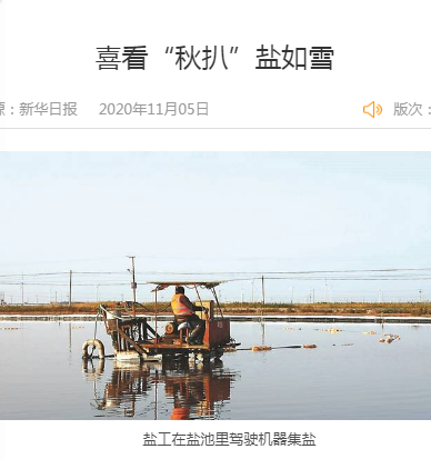 “今天這個(gè)鹽池,正好扒的海鹽。海鹽是我們千年的傳承,我們每年保留了5萬(wàn)噸海鹽。海鹽吃起來(lái)香,因?yàn)樗然c含量在96%左右,剩下的都是微量元素,尤其是含鎂量比較高。這5萬(wàn)噸海鹽,賣價(jià)并不比礦鹽高,但這是我們淮鹽的根。我們對(duì)海鹽有感情、有需要,所以仍然保留它?!比諘裰汽}新河分公司經(jīng)理安樹(shù)林,作為省勞模,他帶領(lǐng)鹽工們不斷進(jìn)行技術(shù)革新,在淮鹽生產(chǎn)上創(chuàng)造了很多成果。輕型自吸式電動(dòng)履帶扒鹽機(jī)、半自動(dòng)式管道架、電動(dòng)活碴器、唐三零“油改電”、循環(huán)纜、機(jī)械式破碴耙、自動(dòng)解繩器……正是這些聽(tīng)起來(lái)晦澀難懂的專有名詞,極大地減輕了鹽工們的勞動(dòng)量。創(chuàng)新,在千年淮鹽的生產(chǎn)中,起到了減少勞動(dòng)強(qiáng)度、提升鹽質(zhì)量的作用。千年淮鹽,體現(xiàn)了極大的發(fā)展韌性。