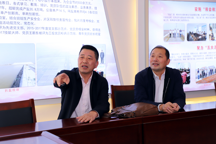 檢查組一行先后到新河制鹽分公司、老機(jī)關(guān)新建黨建室進(jìn)行實地檢查驗收,在新河制鹽分公司黨建活動室,江舜軍部長一行詳細(xì)聽取了該黨支部書記李加新對黨建工作的匯報,隨后,在老機(jī)關(guān)綜合黨員活動中心,檢查組一行利用活動室電子顯示屏觀看了集團(tuán)司歌視頻。