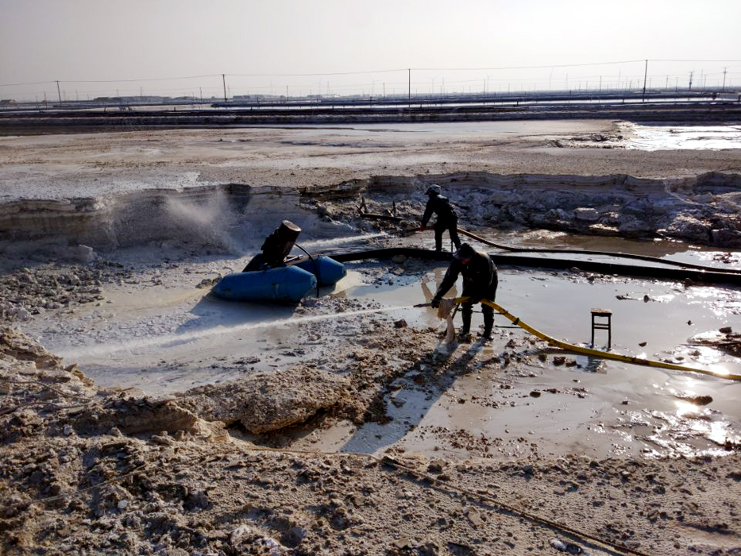 來到埒南制鹽分公司6班硫酸鈣清理現(xiàn)場,只見水槍里射出的水柱把硫酸鈣廢渣沖的四處飛濺,伴隨機器轟鳴聲硫酸鈣廢液被送出灘外,工友們穿好雨衣,戴好頭盔,手握水槍,一站就是3、4個小時,他們兩人一組,輪番作業(yè),確保息人不息機。班長胡繼華信誓旦旦的說我們要發(fā)揚一不怕苦,二不怕累的革命精神,發(fā)揚“有條件要上,沒有條件創(chuàng)造條件也要上”的大慶精神,寧愿多加班,少睡覺也要按期保證完成硫酸鈣清理工作。