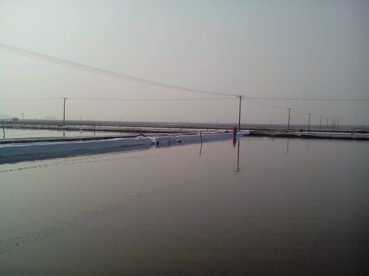 實(shí)業(yè)公司制鹽分公司,海鹽基地結(jié)晶區(qū)改造已近尾聲,灘場舊貌換新顏,放眼望去,海鹽基地灘場一片齊整。