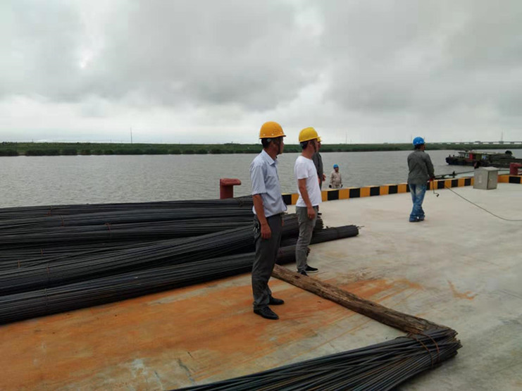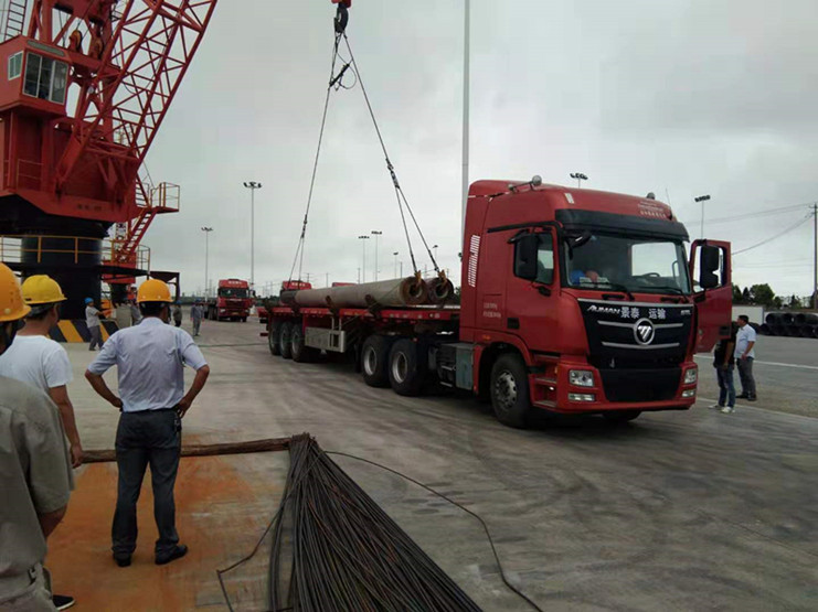 天空飄起了零星小雨,宵洋物流公司總經(jīng)理沈志兵站在雨中,親自指揮工人安裝吊具,固定鋼絲繩。因為這種貨物我們以前沒有裝卸過,所以組裝起來比較有難度。在現(xiàn)場,沈志兵同志多次強(qiáng)調(diào),一定要注意安全,檢查鋼絲繩的接頭是否牢固,一定要保證安全。同事們在小雨中,在沈總的指揮下有條不紊的安裝著吊具,不大一會只見長長的管樁從貨船里騰空而起。