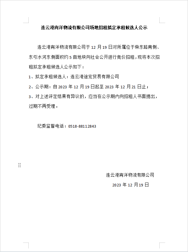 連云港宵洋物流有限公司場(chǎng)地招租擬定承租候選人公示