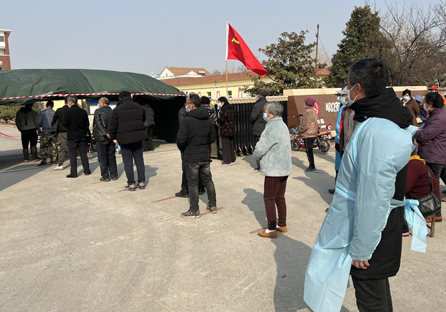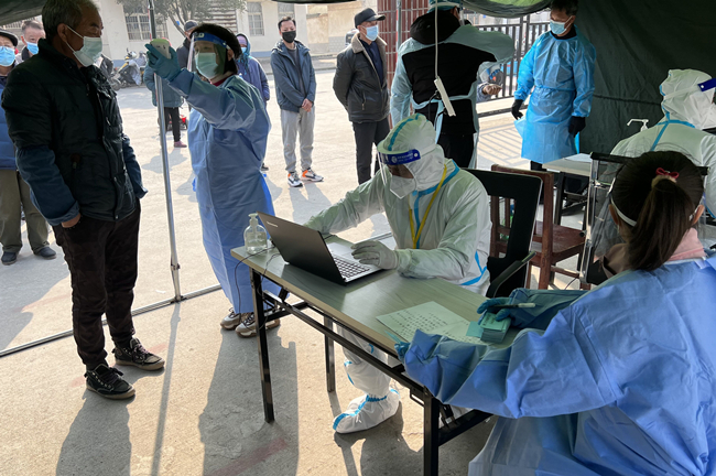 圖為黨員霍晶協(xié)助醫(yī)務(wù)人員對居民進(jìn)行核酸采樣
