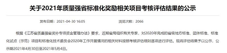 網(wǎng)址鏈接:江蘇省市場監(jiān)督管理局 綜合通知 關于2021年質(zhì)量強省標準化獎勵相關項目考核評估結(jié)果的公示 (jiangsu.gov.cn)