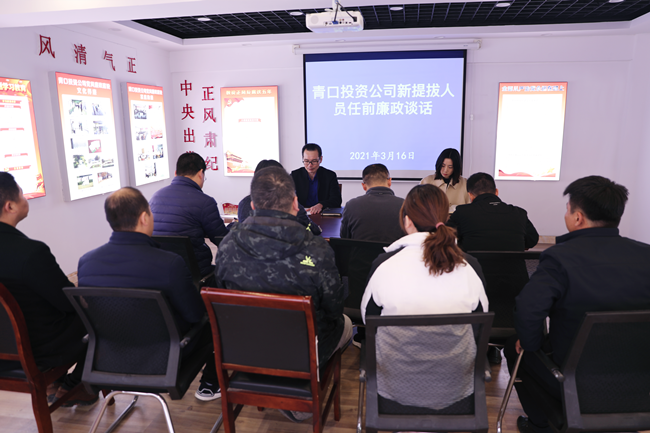 ? ?3月16日下午,青口投資公司紀(jì)委書記朱文兵對九名新提拔人員進(jìn)行任前集體談話,相關(guān)人員參加了此次會議。? ? ? ? ? ? ? ? ?