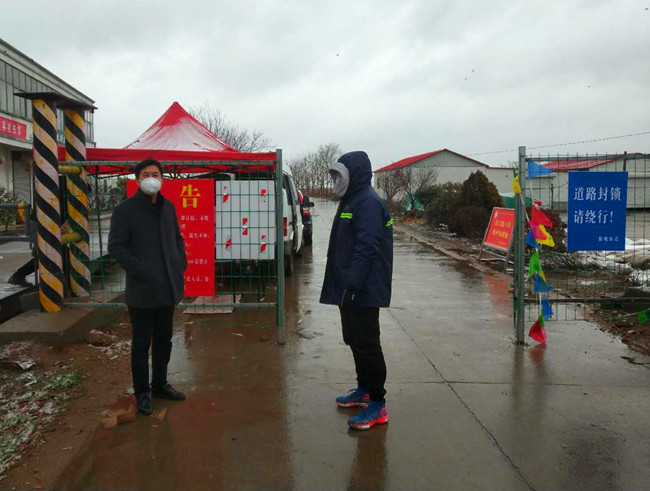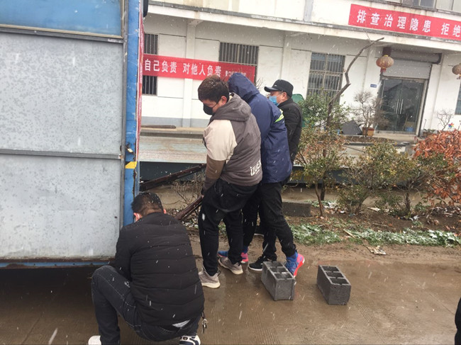 公司黨委書記、董事長胡傳法冒雪檢查成業(yè)飼料卡口,胡書記囑咐在現(xiàn)場值班的團(tuán)青干部防控一線,要動真格不能含糊,堅(jiān)決不給外來車輛通過。負(fù)責(zé)這里還有生產(chǎn)生活服務(wù)中心和黃沙分場的全體管理干部,大家都很辛苦,但沒有埋怨,都在默默地堅(jiān)守崗位,履行職責(zé)。你不站崗我不站崗,誰保衛(wèi)咱大場他們是這樣說也是這樣做的。為了讓值守人員有一個溫暖的臨時休憩的場所,泰祥公司將一個臨時集裝箱拉到卡口,后勤班的小伙子們,搬運(yùn)調(diào)試固定,絲毫沒有因?yàn)楹涞奶鞖庥绊懝ぷ鬟M(jìn)度。