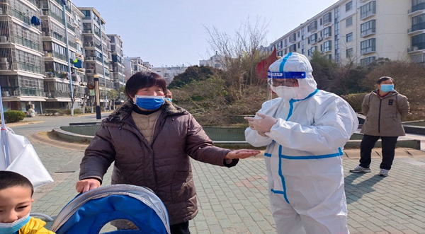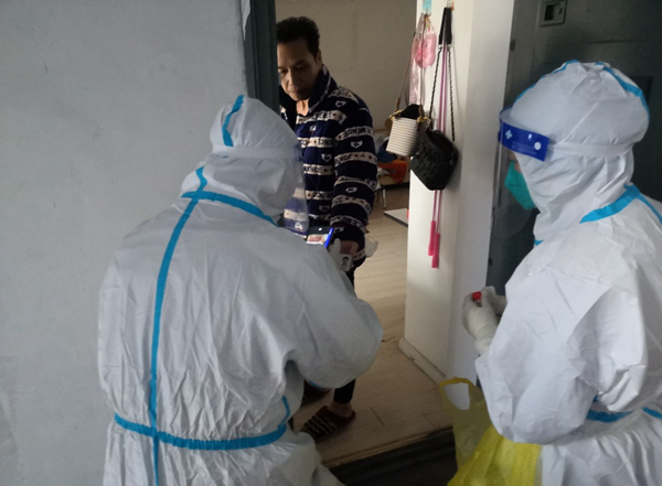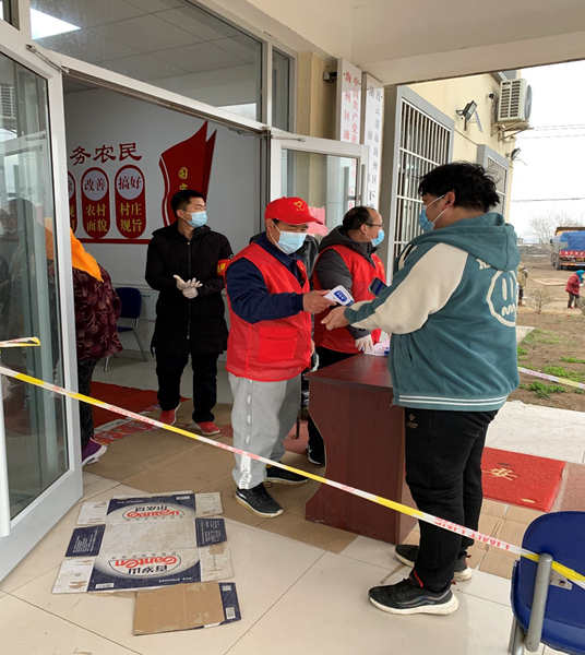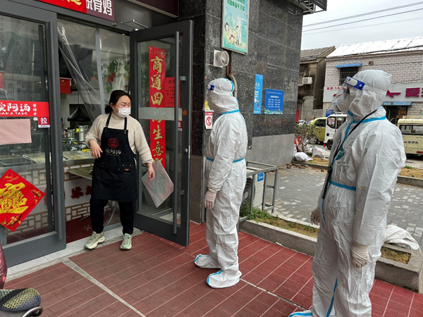 公司員工范益楊、李夢達是集團抗疫志愿隊的隊員。在冷冽寒風中,他倆身穿防護服挨家挨戶通知商戶暫停營業(yè),同樣的通知話語不厭其煩的重復著一遍又一遍,說得口干舌燥、疲憊不堪也未能阻攔他們繼續(xù)前進的腳步。