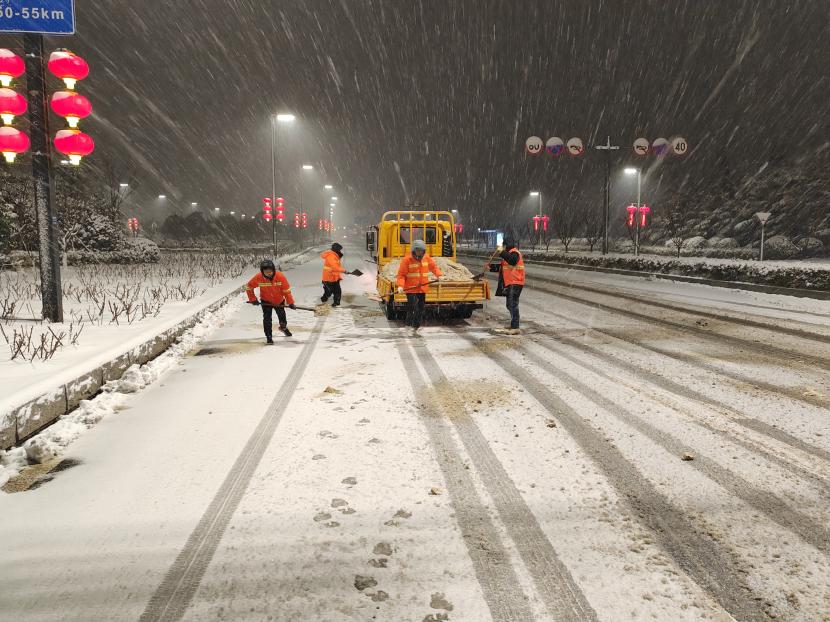 深夜時(shí)分,該公司負(fù)責(zé)人趙陽(yáng)、副經(jīng)理孫振剛等領(lǐng)導(dǎo)班子成員及管理人員,帶領(lǐng)徐育華、王永等數(shù)名工人,對(duì)花果山大道及轄區(qū)易積雪區(qū)域和橋梁陡坡處、事故多發(fā)處開展清雪除冰工作。盡管刮著寒風(fēng),飄著雪花,大風(fēng)肆虐如刀割似的吹拂著臉頰,雪花染白了頭發(fā)、浸濕了衣袖、凍紅了臉龐,可身著橘色工作服的趙陽(yáng)一行,面對(duì)這一難啃的骨頭,卻絲毫沒有懈怠,他們發(fā)揚(yáng)螞蟻啃骨頭的精神,冒著嚴(yán)寒一直與冰雪搏斗。副經(jīng)理朱文江開著工具車慢慢前行,趙陽(yáng)、孫振剛等人緊跟其后,一锨一锨奮力撒融雪劑,徐育華、王永等人則一點(diǎn)一點(diǎn)鏟除地面積雪,現(xiàn)場(chǎng)人員爭(zhēng)先恐后,配合默契,經(jīng)過一夜的連續(xù)作戰(zhàn),隨著太陽(yáng)的升起,終于將公路上的“白色巨龍”降伏。在寒晨的冬陽(yáng)下,他們拖著疲憊的身子離開清雪除冰現(xiàn)場(chǎng),那身橘色的工作服猶如不滅的火炬,融化了冰雪,溫暖了行人。