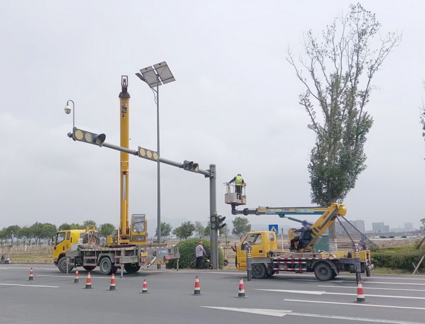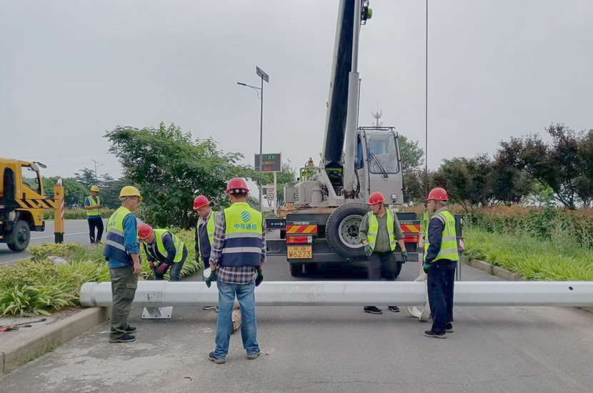 隨后,筆者一行,頂著烈日,驅(qū)車前往翔立分公司市政工程現(xiàn)場(chǎng),在封閉的道路內(nèi),翔立公司一群黃馬甲戰(zhàn)士,正頂著烈日在緊張的進(jìn)行交通監(jiān)控探頭安裝工作。據(jù)了解他們也是5點(diǎn)多種就到崗位上來了。經(jīng)理喬以成帶著兩名員工站在高高的升降機(jī)上,鉗子、扳手、鏍絲刀,各種工具在他們手里輪番操作,汗水已將其工作服的前胸后背浸透。好不容易等到他們安裝完一組探頭下來,我們一邊遞水,一邊采訪,老喬擰開瓶蓋,一口氣喝下半瓶,這才回答我們的問題:“不能不拼啊,我們離盈利還有不小的缺口,現(xiàn)在全公司、全集團(tuán)都在解放思想提質(zhì)增效,不干、不努力哪里來的增效啊!”