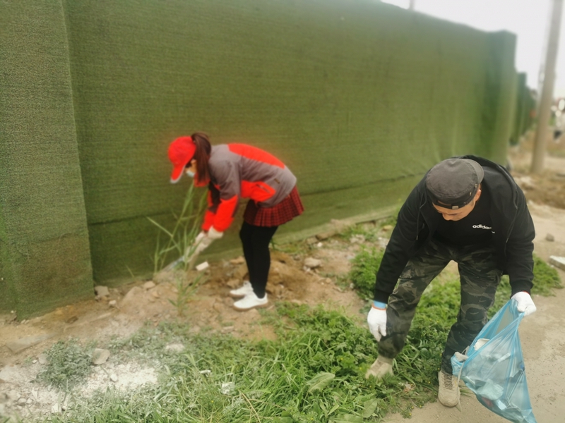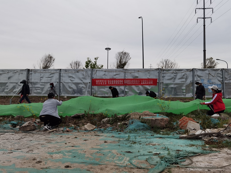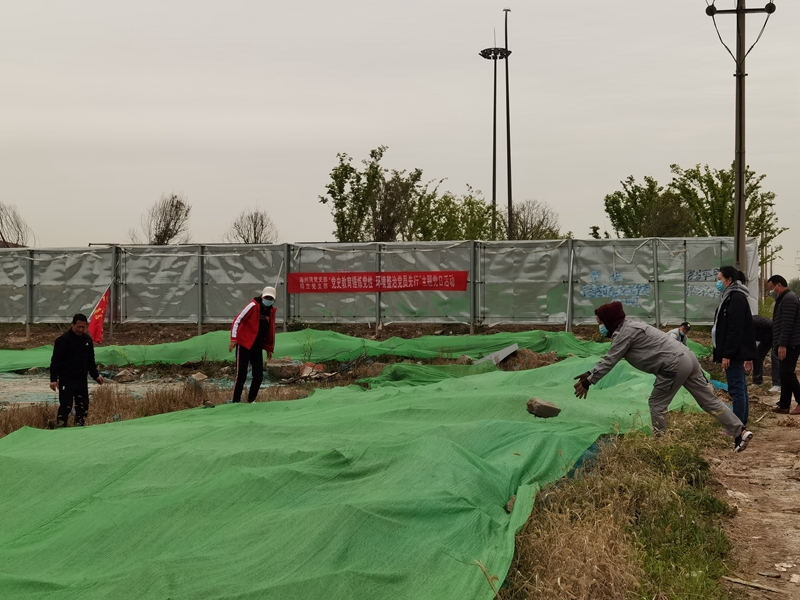 翔立分公司黨支部攜手海州灣公司黨支部對公司的車站小灘進行環(huán)境整治,為裸露在外的土地進行防塵網(wǎng)鋪設(shè)。