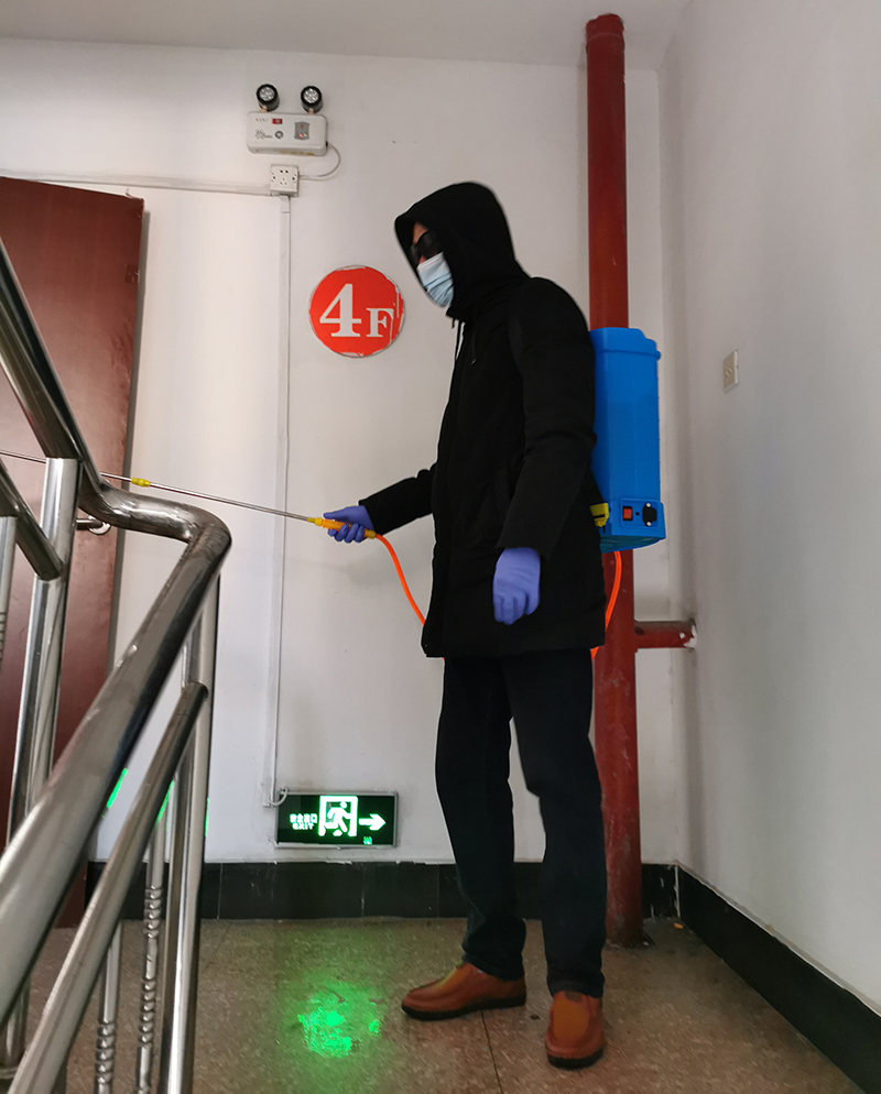義務(wù)消毒,沒有報(bào)酬,得隨時(shí)待命,看起來是應(yīng)者寥寥的苦差。在昌圩湖職工小區(qū)和公司機(jī)關(guān)大樓,卻穿梭著這樣的身影。他們背著裝滿消毒液的噴壺,穿梭在社區(qū)街道和辦公場所,把消毒液噴灑到的每一處。