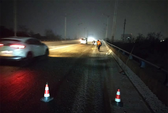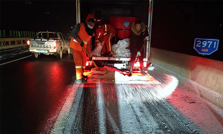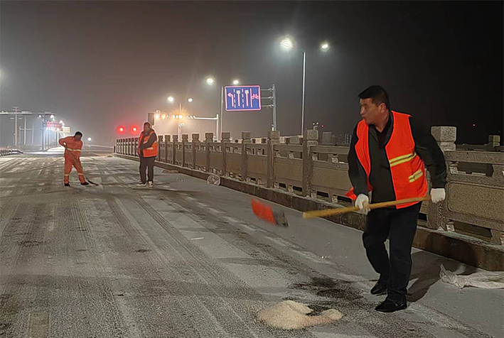 該公司除雪突擊隊由總經(jīng)理徐習華和副總王利分頭帶隊指揮,集結(jié)了安全部、管養(yǎng)部、綠化、保潔、市政、環(huán)衛(wèi)的突擊隊員80余名,出動5輛皮卡車、3輛皮卡、1臺裝載機和2輛巡查車,主要負責新區(qū)內(nèi)橋梁、連云開發(fā)區(qū)橋梁、徐新路、疏港大道、228省道等主要交通干道布撒融雪劑抗凍救災工作。突擊隊員在進行融雪劑撒布作業(yè)的同時,及時清理路面融化雪水,防止再次結(jié)冰,各除雪設備配合作業(yè),階梯式向前推進,提高除雪效率。(李敏 王宜全)